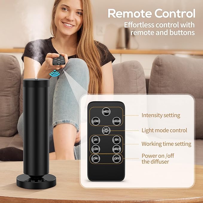 - Smart Scent Control at Your Fingertips: Adjust intensity settings(L, M, H), time settings(2H,6H,12H,24H/7), and personalize your experience using the intuitive touchscreen or handy remote. Create the perfect ambiance in just one tap