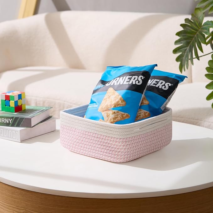 Small Square Shallow Baskets for Organizing, 9.7x9.7x4.3 Inch Rope Woven Storage Bins for Cubes Closet, Shelves Storage, Boho Decorative Basket, 2 Packs Off White Pink