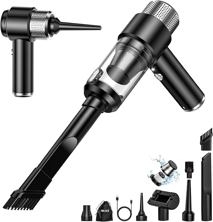 - 【4 In 1 Car Vacuum Cleaner 】This handheld vacuum cleaner combines 4 in 1: suction, blowing, inflation and vacuum compression. It comes with 7 accessories to deal with cleaning. Whether it's removing small debris, crumbs and dust from corners and surfaces with the floor brush or flat nozzle, or using the blowing nozzle to clean the crevices of keyboards and tight spaces, it's easy to use for small jobs. In addition, suction nozzle and inflation nozzle makes it quick and easy to inflate and deflate items such as swimming rings and air mattresses.