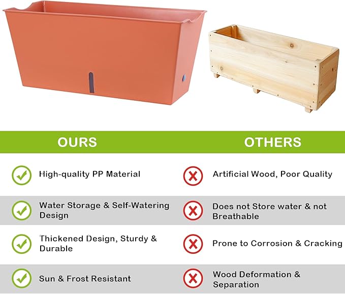 - 【Premium & Durable】This self-watering planter pot has a marble frosted design, which is very textured and it uses high-quality PP material to provide an all-round growing environment for plants, keep your plants growing healthily. This window box planter is sturdy, wear-resistant and durable. It can be exposed to light, wind, and sunlight for long periods of time, with a lifespan of decades. It is an excellent planter box for both indoor and outdoor.