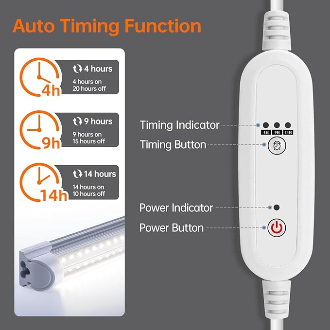 - Convenient Timer Function - The integrated timer feature allows you to effortlessly set the grow light to turn on and off automatically at your preferred intervals (4, 9, or 14 hours). This guarantees your plants receive consistent attention, whether you’re on vacation or busy with work