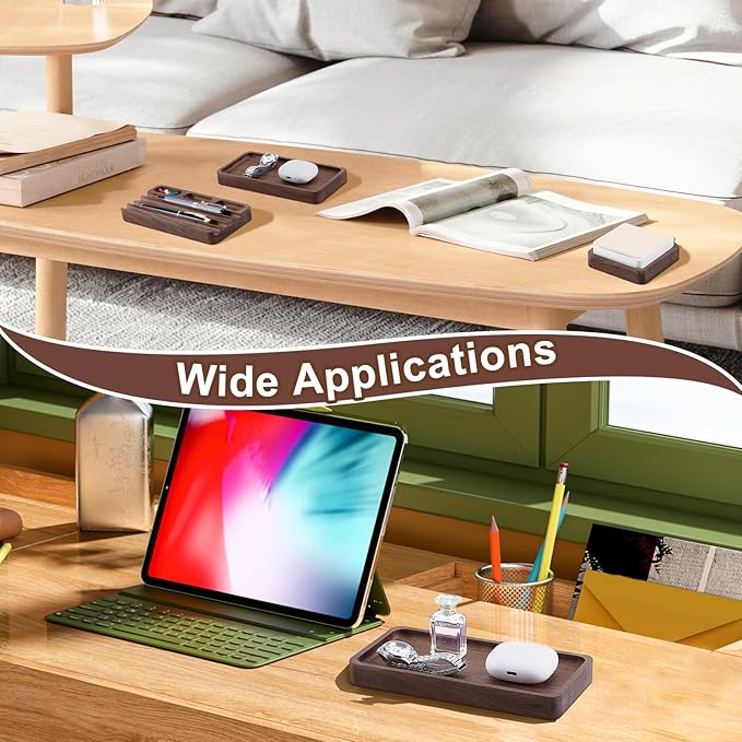 - ✔【Premium Materials】Our walnut trays are made of durable walnut and have a rectangular design. Their exquisite wood grains add a natural beauty and unique texture to this storage tray. The pen tray can accommodate 4 pens or pencils, and has 3 separate compartments for storing small objects such as paper clips; the remaining 3 separate trays can accommodate office supplies and personal belongings.