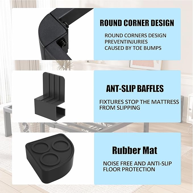 - Special Feature : No Box Spring Needed, Rounded Corner, Anti-slip and Noise-free Rubber Pads