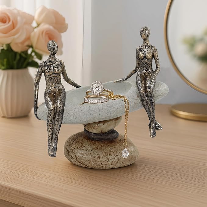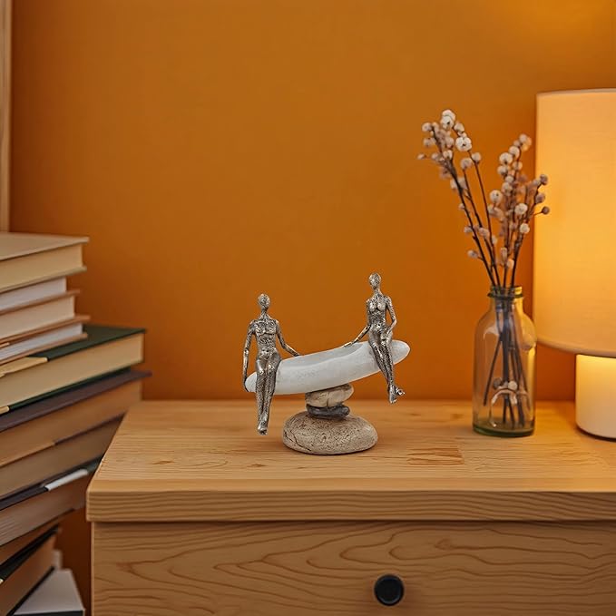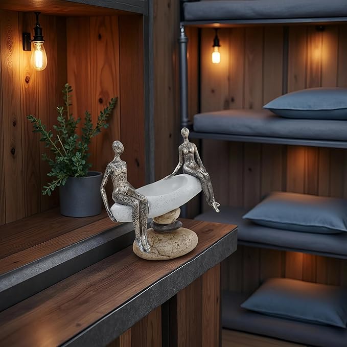 - Zen-Inspired Design – Featuring two abstract human figures seated gracefully on a round stone-like platform, this sculpture captures harmony, mindfulness, and tranquil companionship in a minimalist form.