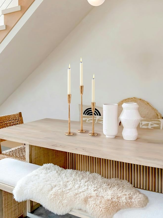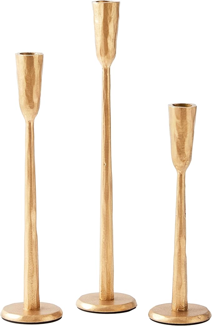 - [Taper Candle Holders] - This beautiful candle holder set comes in 3 heights, sleek, heavy weight and highly industrial vintage style. The warm antique gold painted finish and the visual effect of the high and low undulating candlelight gives you a wonderful feeling.