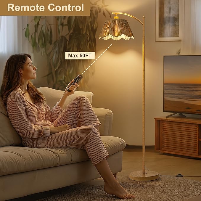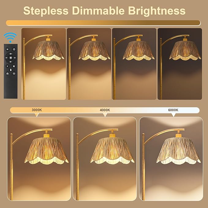 - 【Stepless Dimmable & 3 Color Temperatures】Saving your time to look for compatible bulbs, Our rattan floor lamp comes with an E26 smart bulb, which supports stepless brightness (1%-100%) and 3 color temperatures (3000K-6000K)and timer settings(1hour)as needed, This dimmable floor lamp also have pre-set modes offering various scenes such as: read, nursery, work and night light.The memory function can help you remember the last setting.