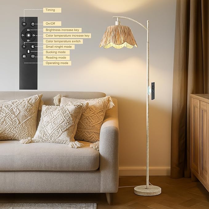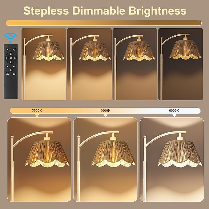 - 【Stepless Dimmable & 3 Color Temperatures】Saving your time to look for compatible bulbs, Our rattan floor lamp comes with an E26 smart bulb, which supports stepless brightness (1%-100%) and 3 color temperatures (3000K-6000K)and timer settings(1hour)as needed, This dimmable floor lamp also have pre-set modes offering various scenes such as: read, nursery, work and night light.The memory function can help you remember the last setting.