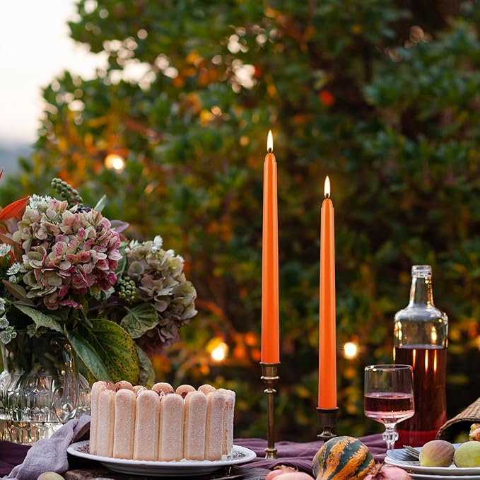 - 1. 【Premium 10-Inch Taper Candles - Set of 12】 This value pack includes 12 elegant orange taper candles measuring 10 inches tall - perfect for creating striking centerpieces and seasonal displays. Each candle burns cleanly for extended periods.