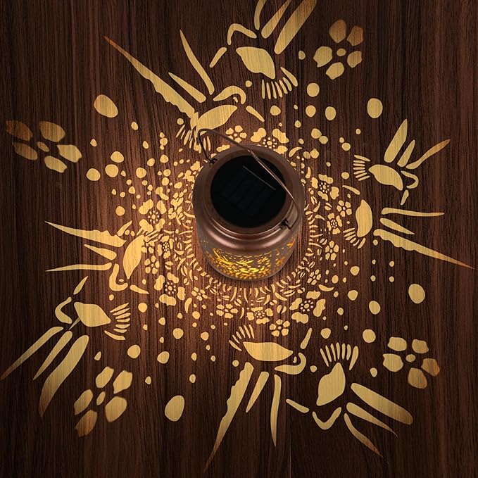 - 【Elegant Garden Decor】- Enhance the beauty for your lovely garden with these exquisite hummingbird solar lanterns outdoor waterproof! Featuring a vintage design with a gold copper finish and delicate hollow out metal veneer, the solar lanterns cast a mesmerizing glow with a radiant Hummingbird and flower pattern, enjoy a touch of elegance and warmth to your every night.
