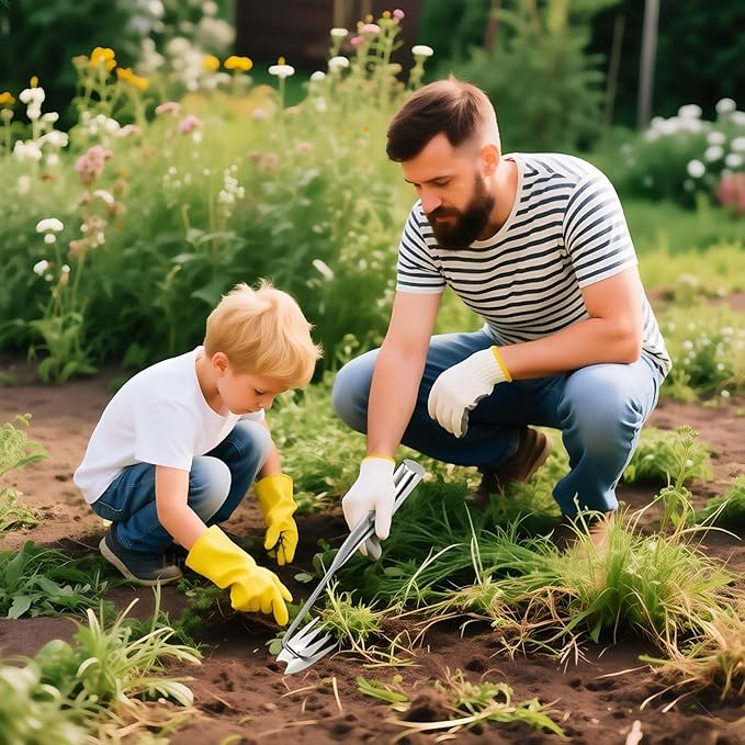 - [Four-tooth dual-purpose weeder]: The unique four-tine V-shaped dual-purpose design ensures thorough penetration in all soil types, eliminating the need for manual weed removal! Even in tight spaces, weed puller tool can easily handle stubborn plants like deep-rooted thistles and dandelions, delivering an efficient gardening experience.