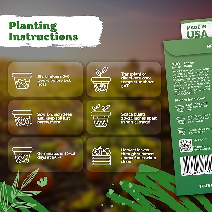 - High Germination Rate: organic lemon balm seeds sprout in 10-14 days at 65 °F when barely covered (1/4" deep max) and lightly misted with 20–24" spacing. Perfect for USDA zones 4-9 outdoor garden, beds and indoor garden pots.