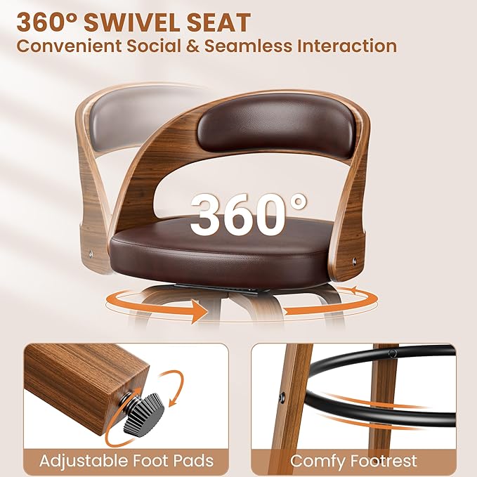 Bar Stools Set of 4, 26" Swivel Counter Height Barstools with Bentwood Legs and Back, Mid Century Modern Faux Leather Upholstered Bar Chairs for Kitchen Island, Restaurant, Brown
