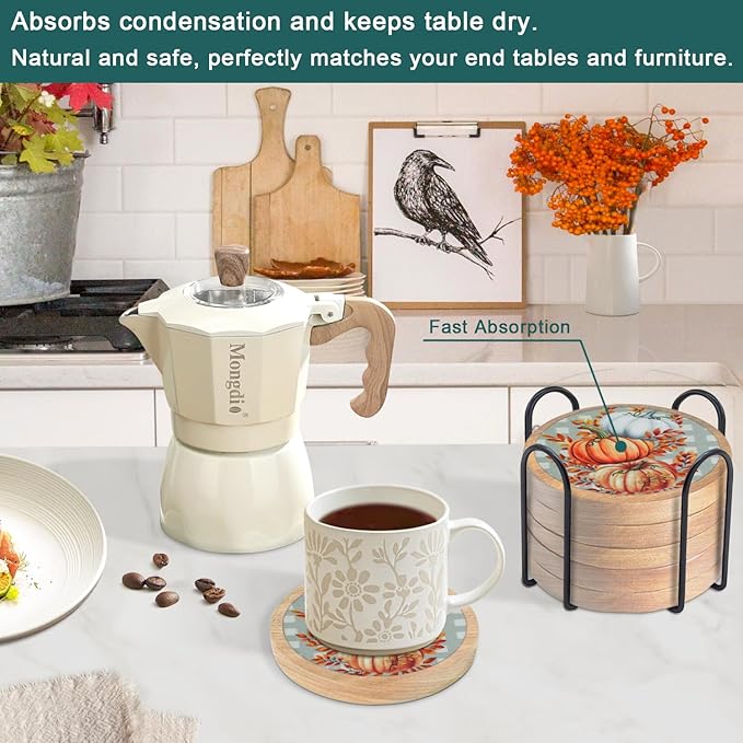 Fall Coasters Set of 6, Pumpkins Coaster, Minacun Absorbent Coasters with Holder Halloween Thanksgiving Themed Party Decoration 4.3 Inch