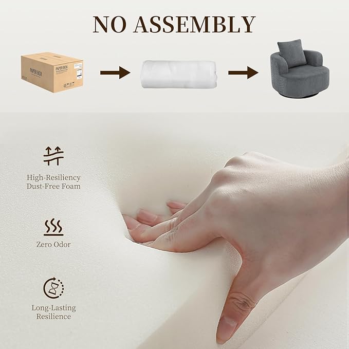 - [SUPERIOR COMFORT & SUPPORT] This swivel barrel chair experience cloud-like softness with premium high-resilience foam cushioning, paired with a removable back support pillows. The semi-reclined design and extra-wide seat 34" ensure ergonomic comfort for all body types.