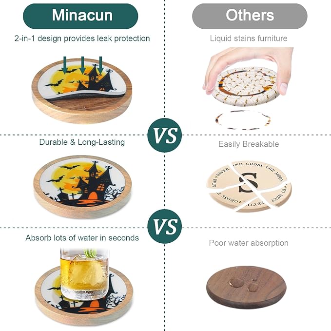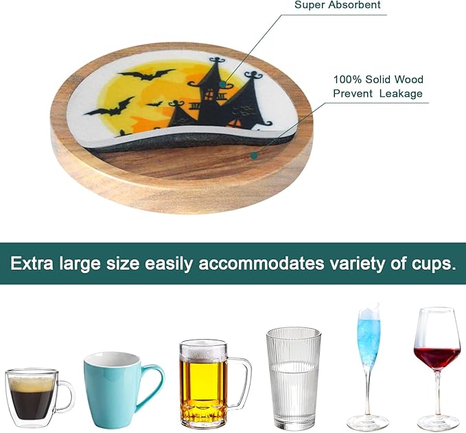 Halloween Coasters Set of 6, Unique Coaster, Minacun Absorbent Coasters with Holder Halloween Thanksgiving Themed Party Decoration 4.3 Inch