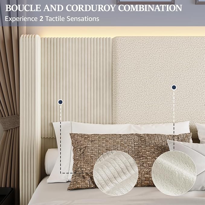 - Dual-Texture Elegance: Lihimte modern queen bed frame with headboard combines fluffy boucle with smooth corduroy, delivering a visually impactful and multi-layered tactile experience that balances comfort and beauty while enhancing the overall ambiance of your bedroom