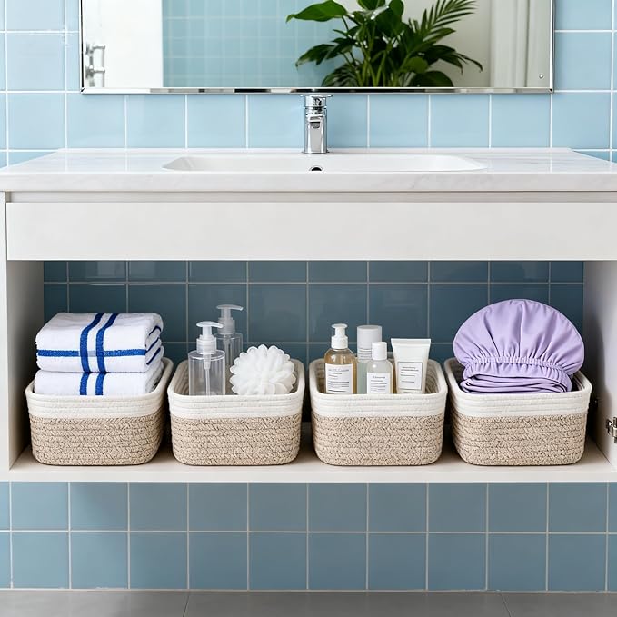 4-Piece Storage Shelf Basket Set, Natural Cotton Rope Woven Basket with Handle, Decorative Rectangle Organizer Bin for Home, Nursery, Montessori, Pet Toy Storage and Bathroom Organization, White&Brown