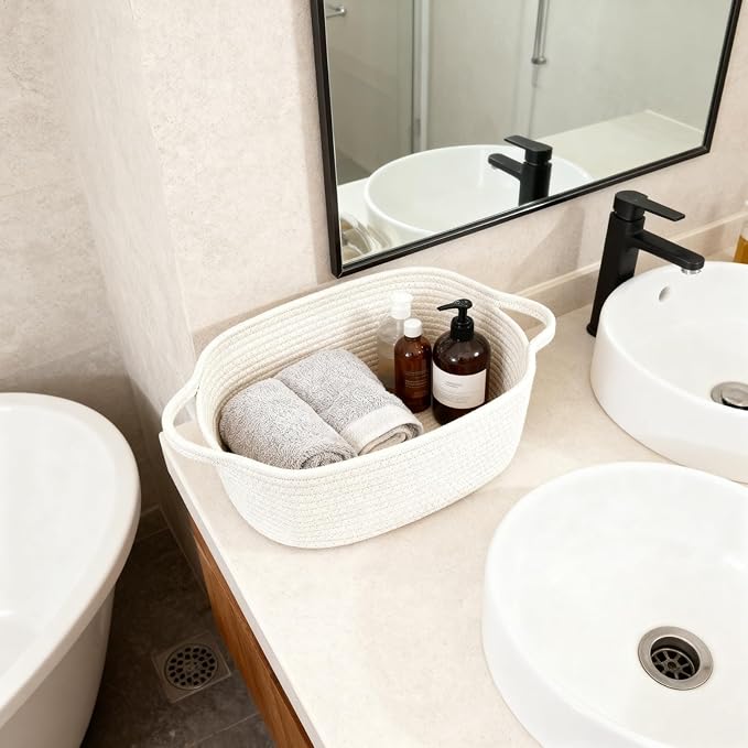 BOMINICA Cotton Rope Storage Basket with Handles, Natural Woven Basket, Decorative Rectangle Organizer Bin for Home, Nursery, Montessori, Pet Toy Storage and Bathroom Organization, White