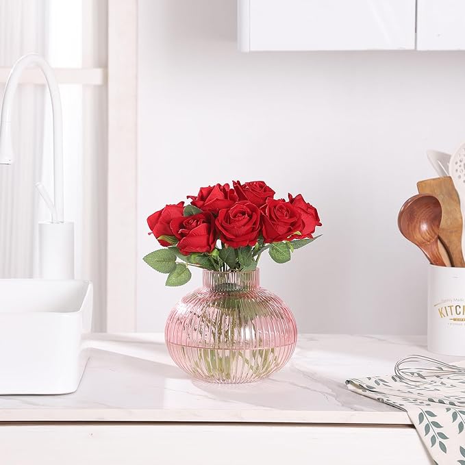 Pink Glass Vase for Tulips, Ribbed Glass Vase for Flowers, Round Flower Vases, Small Short Vases for Living Room, Office, Coffee Table, Shelf, Wedding, 6 Inches