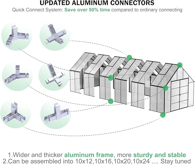 - Sturdy Frame: Our greenhouse kit boasts a robust rust-resistant aluminum frame designed to withstand various weather conditions. Introducing patented technology, Easy assembly, saving you 50% of your time. Gone are the days of tedious setups. With a simple push and locking screw, our Quick Connect ensures a reliable, secure, and swift link-up. It can also support snow loads of up to 20PSF.
