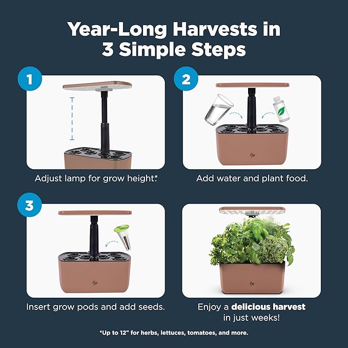 - HOMEGROWN FRESH FLAVOR ALL YEAR: Grow up to 6 of your favorite herbs, veggies, or flowers (up to 12 inches tall) indoors for a garden that’s always in season no matter where you live, no sun or soil required (seed pod kits sold separately)