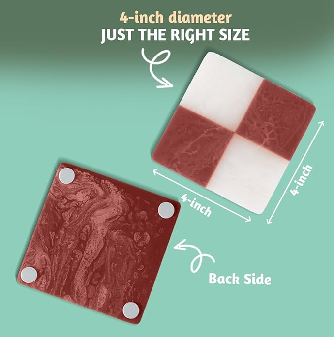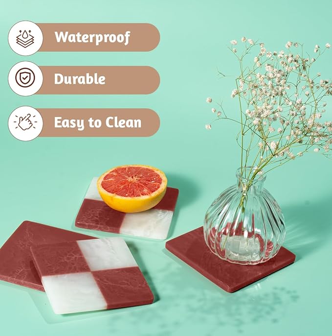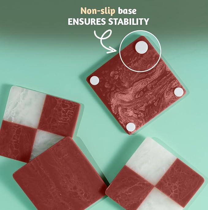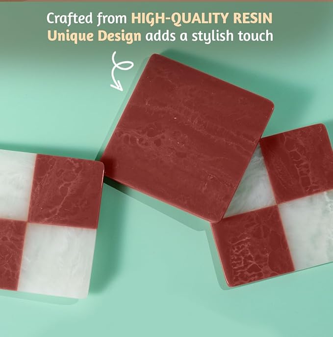 - UNIQUE AESTHETIC DESIGN – Crafted from premium resin, these table coasters or coaster set feature a lively multicolor checkered design that brings a sophistication to any space. The durable resin material ensures lasting beauty, making them both a stylish and practical choice for any setting. Perfect coasters for red home decor.