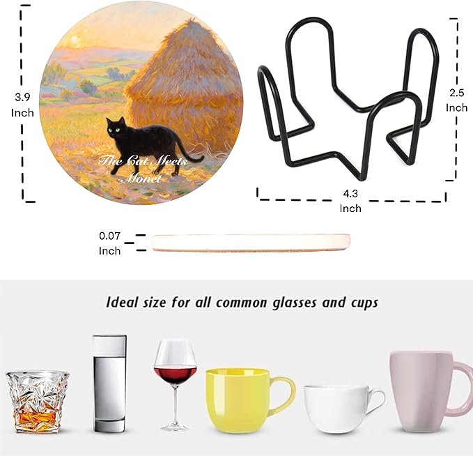 - Complete Set of 6 with Holder & Transform into Wall Art! Receive six (6) exquisitely crafted ceramic coasters featuring charming black cats in Monet's oil painting style, plus a sleek matching holder. Each coaster boasts a smooth, gallery-quality finish, making them stunning miniature artworks. Easily frame them to create captivating wall decor for your living room, kitchen, office, coffee bar, or as unique wall art – doubling your decorating possibilities!