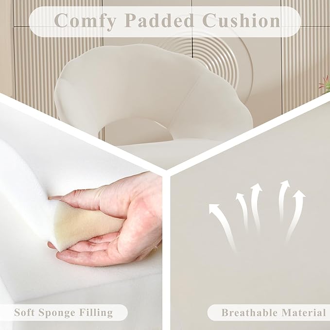 - Vanity Chair with Hollow Back- This velvet chair has a curvy petal shape and a rustic light color that gives it a warm, modern aesthetic. The U-shaped arms give the chair a striking look, and the slightly sloped back makes it easy to sink into.