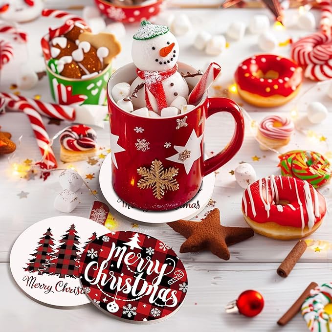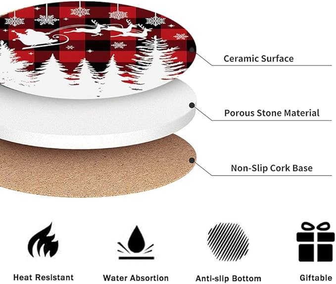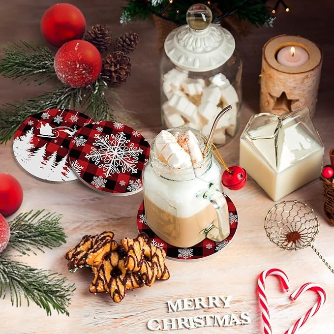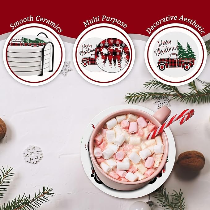 - FESTIVE DESIGN: Beautiful Christmas-themed ceramic coasters featuring red buffalo plaid patterns with snowflakes, trees, vintage truck, and holiday messages