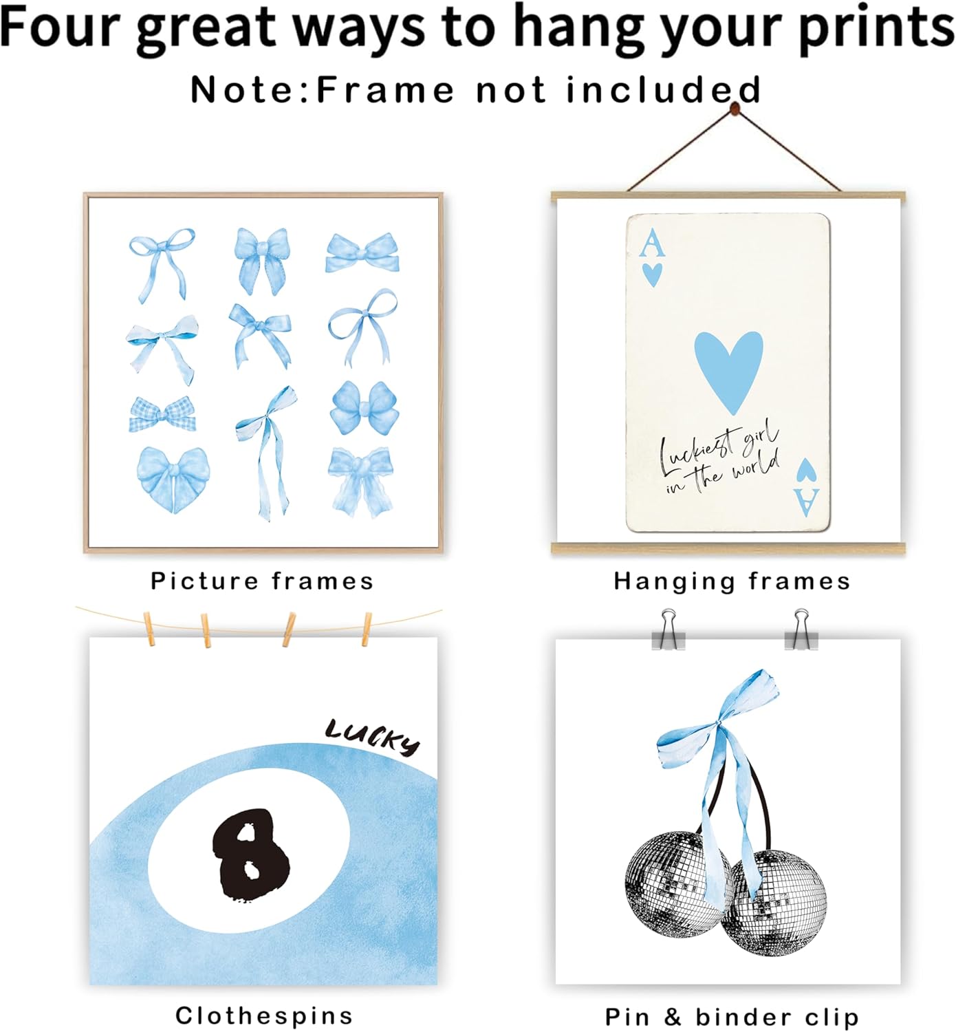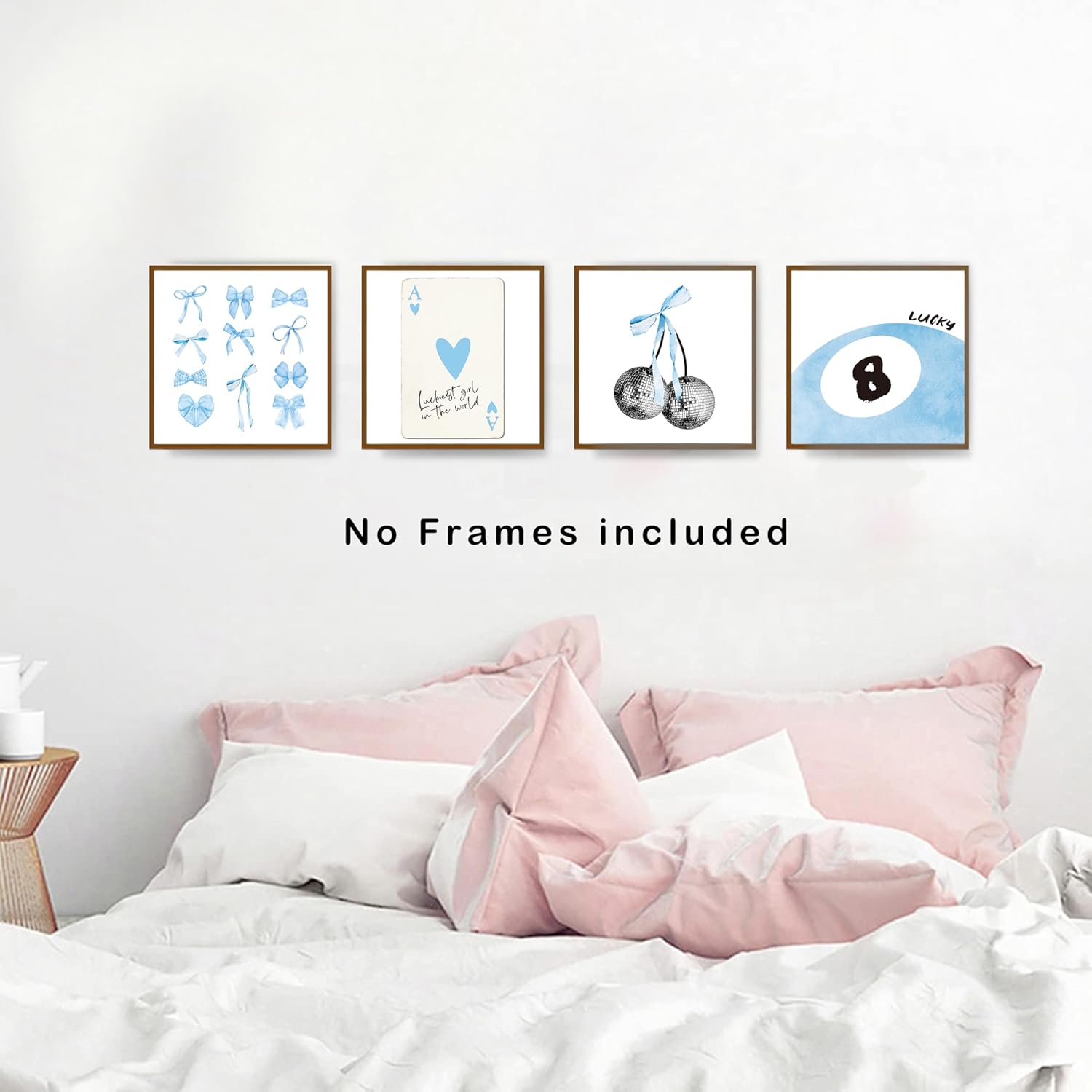 okaxscm Blue Coquette Trendy Preppy Wall Art Prints Set of 4, Coquette Room Decor, Preppy Room Decor Aesthetic, Blue Bow Disco 8 Ball Cherry Wall Decor Posters for Girls Bedroom Dorm, 10x10 Unframed