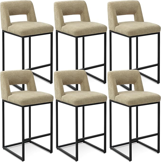 Counter Height Bar Stools Set of 6 for Kitchen Counter Modern Bar Chairs with Backs for Kitchen Island with Upholstered Fabric Seat and Metal Frame, Khaki, 26 Inch