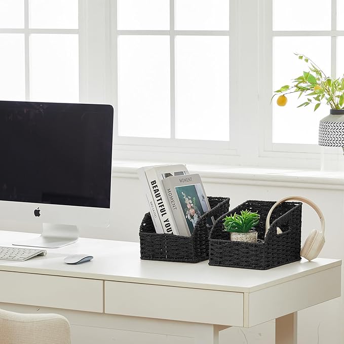 Wicker Baskets for Organizing,Pantry, Kitchen Counter with Handles, Handwoven Woven Storage Baskets for Fruit, Bread, Vegetable, Paper Storage Bins for Shelves, 3 Pack, Black