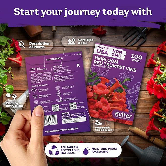 - Rapid Climbing Growth: Soak Trumpet creeper vine seeds for 24h & sow 1/16" deep at 70°F+ soil. This native woody vine gardening seeds flourish quickly, reaching up to 30 feet tall if unchecked.