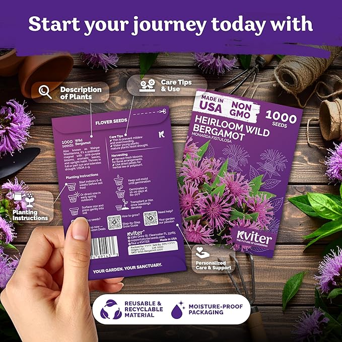 KVITER 1,000 Wild Bergamot Seeds for Planting (Monarda fistulosa) – Bee Balm Native Wildflower, Pollinator Magnet, Organic & Non GMO – Perennial Flower Seeds to Plant Outside in Flower/Herb Garden