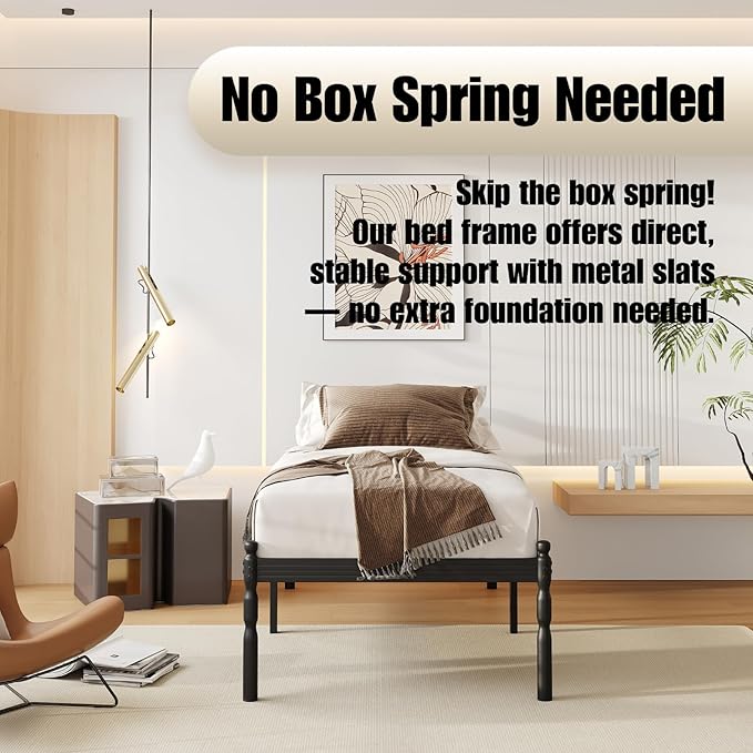 - Quick-Assembly Bed Frame Twin Size: Foldable side beams and a tool-free slat system enable effortless setup. All hardware included—single-person assembly completed in minutes. Platform bed frame twin size design requires zero technical expertise.