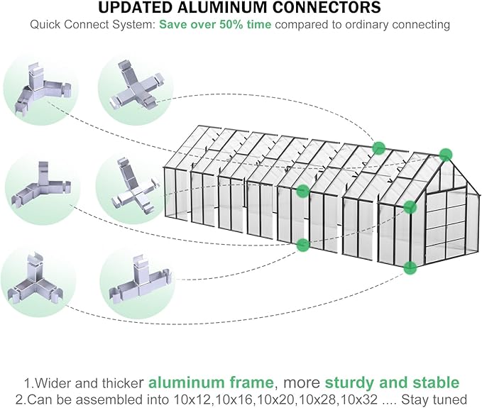 - Sturdy Frame: Our greenhouse kit boasts a robust rust-resistant aluminum frame designed to withstand various weather conditions. Introducing patented technology, Easy assembly, saving you 50% of your time. Gone are the days of tedious setups. With a simple push and locking screw, our Quick Connect ensures a reliable, secure, and swift link-up. It can also support snow loads of up to 20PSF.