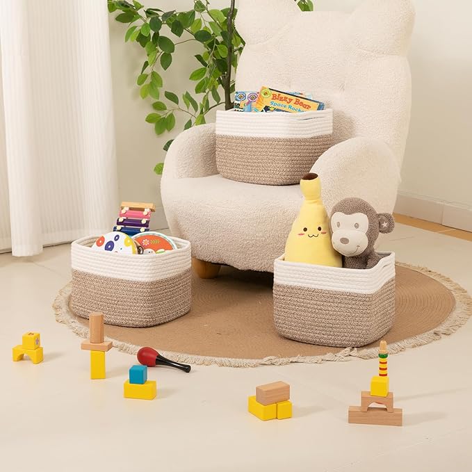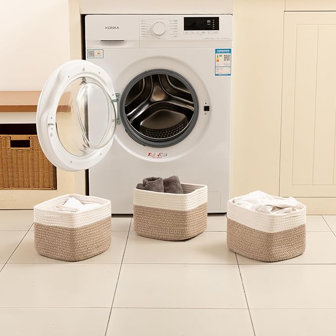 OIAHOMY 9”x9”x7” Storage Cubes, Cotton Rope Woven Baskets for Organizing, Cube Storage Bin, Small Gift Basket for Shelf, 3-Pack, Brown&White