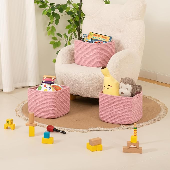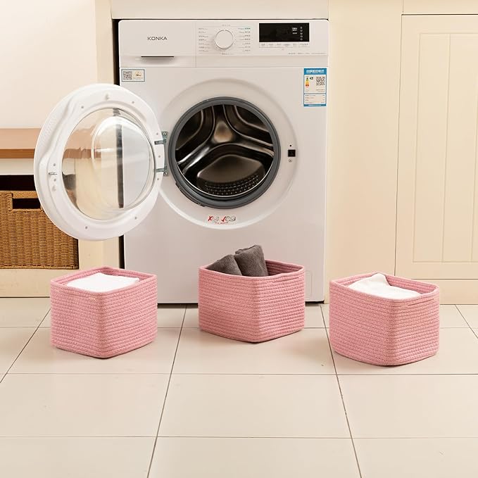 OIAHOMY 9”x9”x7” Storage Cubes, Cotton Rope Woven Baskets for Organizing, Cube Storage Bin, Small Gift Basket for Shelf, 3-Pack, Pink