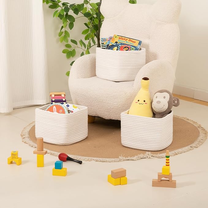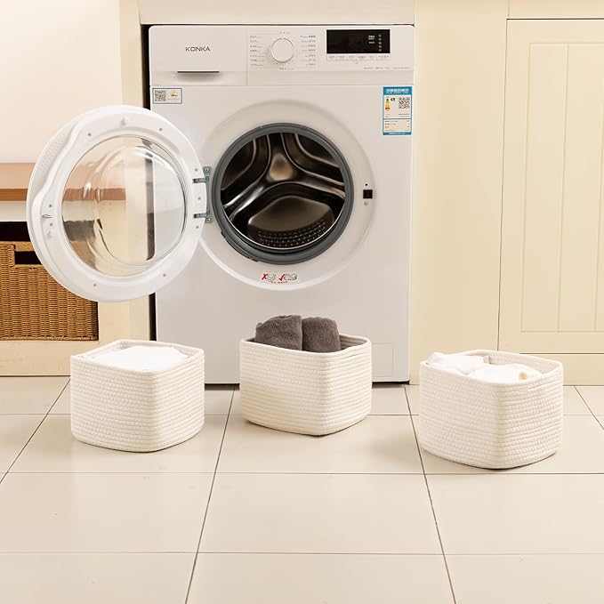 OIAHOMY 9”x9”x7” Storage Cubes, Cotton Rope Woven Baskets for Organizing, Cube Storage Bin, Small Gift Basket for Shelf, 3-Pack, White