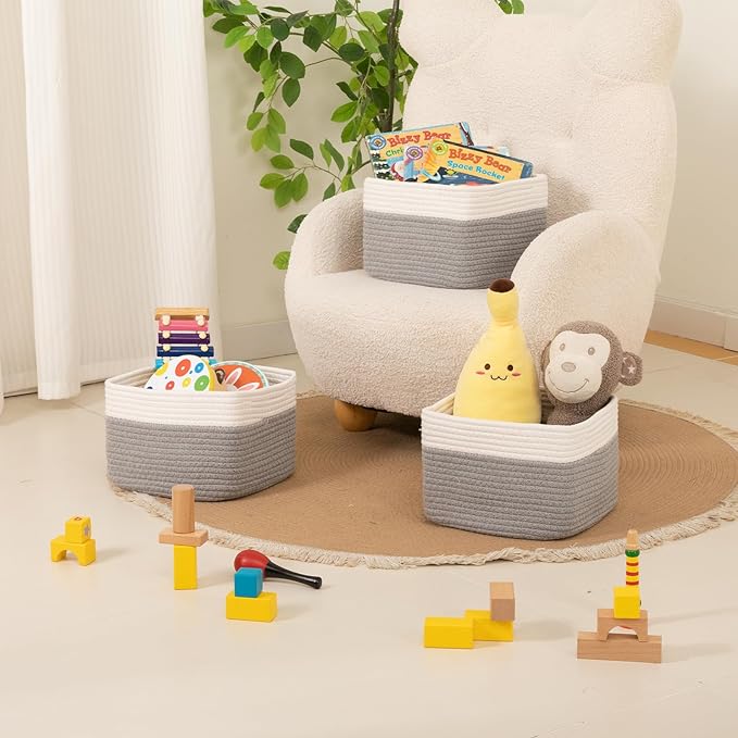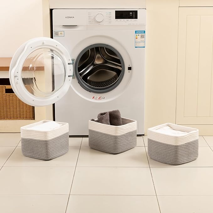 OIAHOMY 9”x9”x7” Storage Cubes, Cotton Rope Woven Baskets for Organizing, Cube Storage Bin, Small Gift Basket for Shelf, 3-Pack, Grey&White