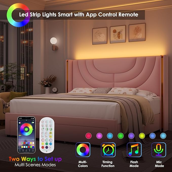 HITHOS Full Upholstered LED Bed Frame with 2 Storage Drawers, Velvet Platform Bed with Wingback Headboard, Solid Wooden Slats Support, No Box Spring Needed, Headboard Splicing Design, Pink