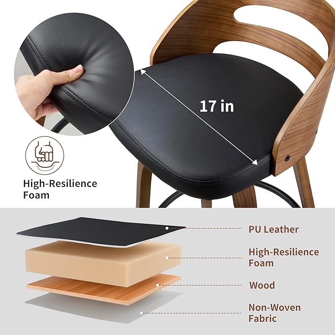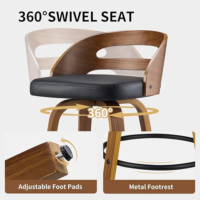 Swivel Bar Stools Set of 2, 26 Inch Counter Height Chairs with Walnut Wood Frame and Black Leather, Low Back, Footrest & Easy-Clean Design for Kitchen, Bar, or Dining Area