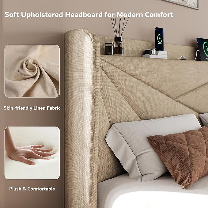 iPormis Full Size Bed Frame with Charging Station, Linen Platform Bed Frame with Wingback Upholstered Headboard, Solid Wood Slats Support, No Box Spring Needed, Easy Assembly, Beige