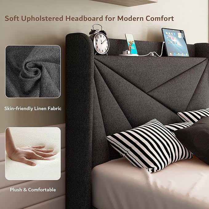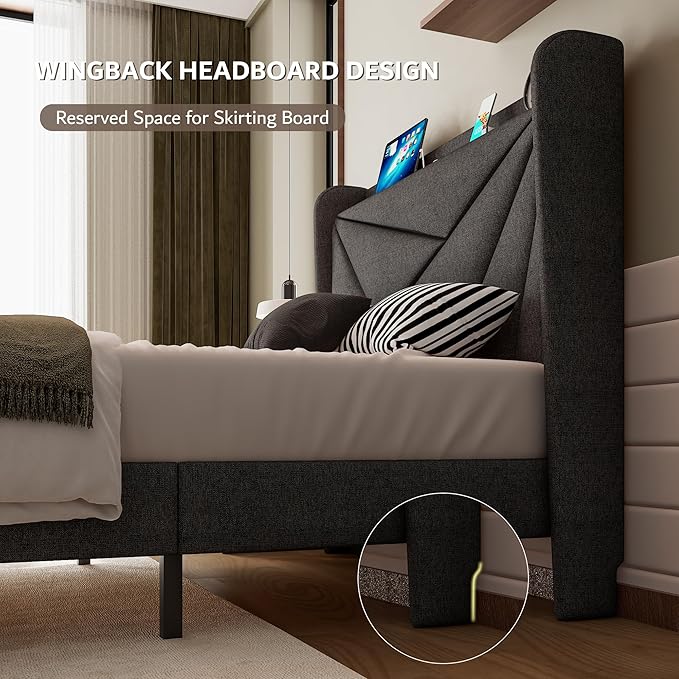 iPormis Twin Size Bed Frame with Charging Station, Linen Platform Bed Frame with Wingback Upholstered Headboard, Solid Wood Slats Support, No Box Spring Needed, Easy Assembly, Dark Grey