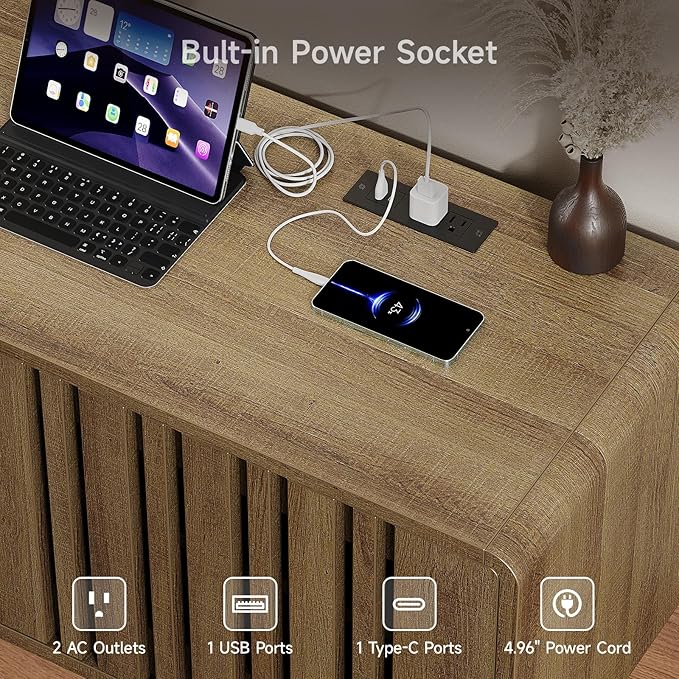 - Practical and Stylish:This entertainment center features a smooth plank surface finish and safety rounded corners designed to prevent everyday bumps. It includes a built-in power socket with 2 AC outlets, 1 USB port, and 1 Type-C port, offering convenient charging for all your devices