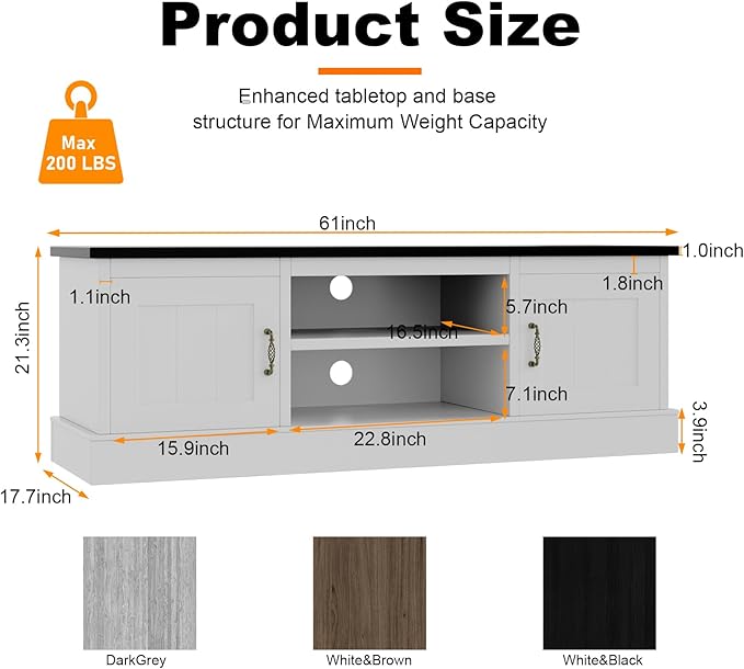 Farmhouse TV Stand for 65 Inch TVs Entertainment Center with Storage Cabinets Modern Media Console Table Rustic Wood Design for Living Room Office 61 * 17.7 * 21.7 Inch White&Black