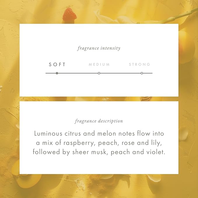 - Crisp & Invigorating Fruity Floral Scent – A soft, odor-neutralizing fragrance where luminous citrus and melon notes open into a delicate heart of raspberry, peach, rose, and lily, finishing with a sheer base of musk, peach, and violet. From the Fruity–Floral family, it captures the uplifting feeling of walking in the rain as the sun breaks through the clouds.
