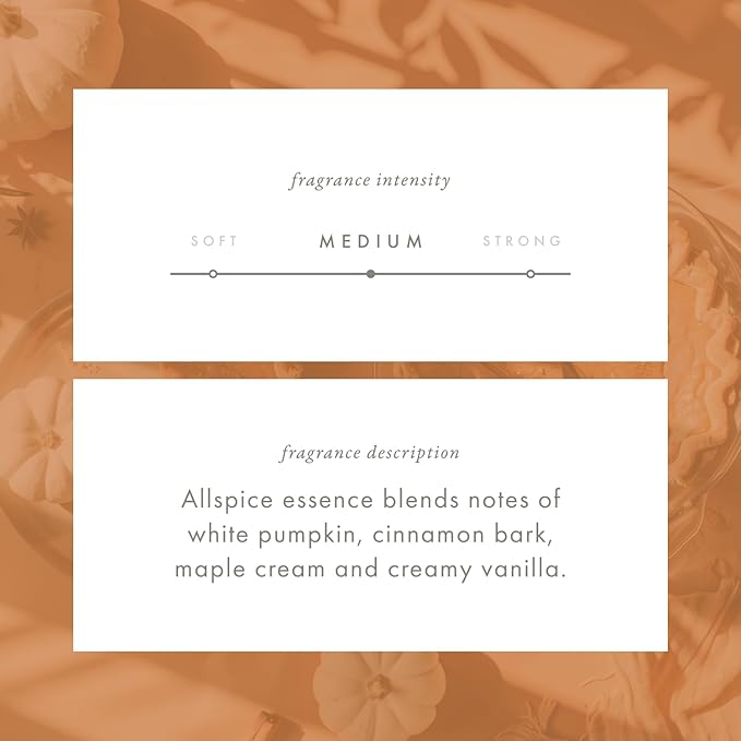 - Cozy Seasonal Spice Scent – A medium-strength fragrance where allspice essence blends with white pumpkin, cinnamon bark, maple cream, and creamy vanilla. Warm top notes of amber, mandarin, and allspice flow into a heart of pumpkin and cinnamon, finished with a comforting base of maple cream, guaiacwood, and vanilla. From the Seasonal–Spice family, it smells like baking a holiday favorite for the Thanksgiving table.