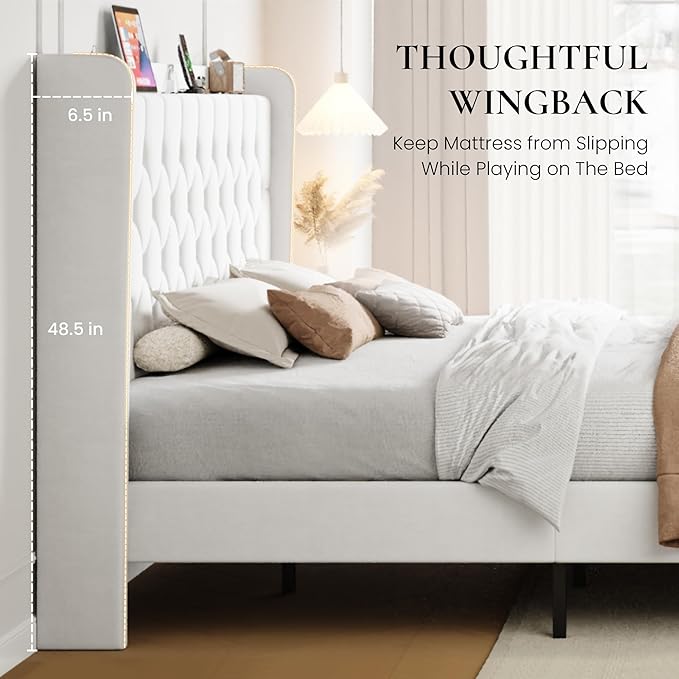 SHA CERLIN King Size Platform Bed Frame with Charging Station, Velvet Wingback Headboard with Storage Shelf, Wooden Slats Support, Ample Under-Bed Space, No Box Spring Needed, Easy Assembly, White