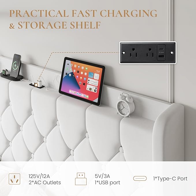 - Built-in Charging Station: This queen bed frame features a built-in charging station with 2 AC outlets, 1 USB port, and 1 Type-C port, allowing you to conveniently charge your devices right by the bed